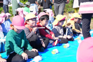 芋掘りを楽しんだあとは頂いた 豚汁とおにぎり をみんなで食べました🍙